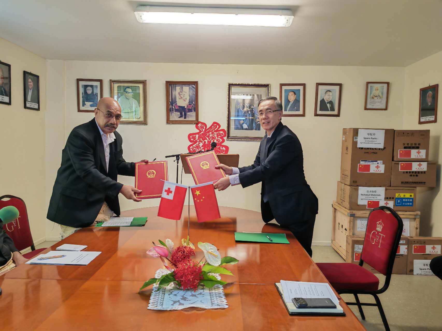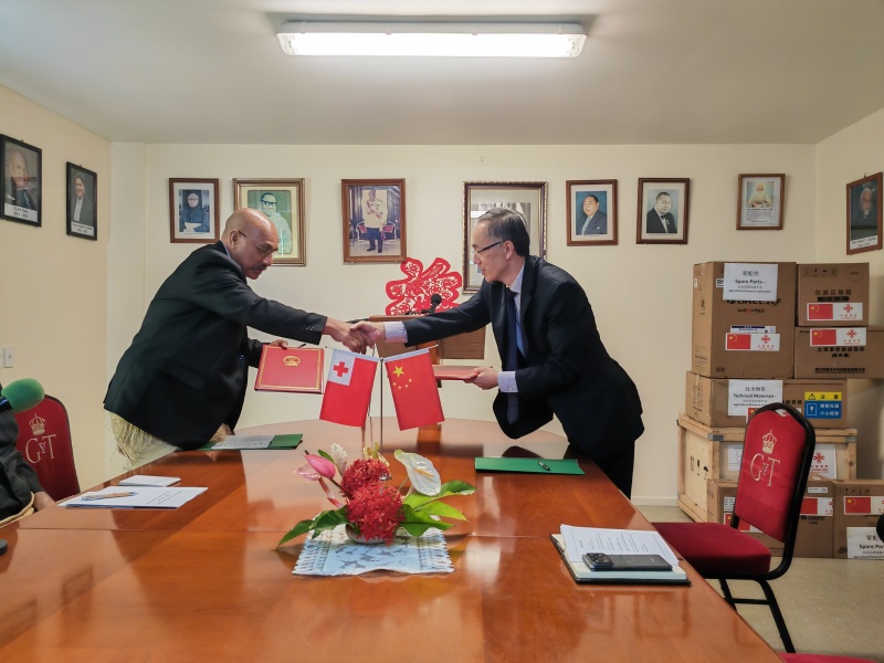 2月18日,刘为民大使和汤加新任农业、食品和林业大臣哈拉瓦塔乌一同出席中方向汤方捐赠农业物资交接仪式并签署交接证书。