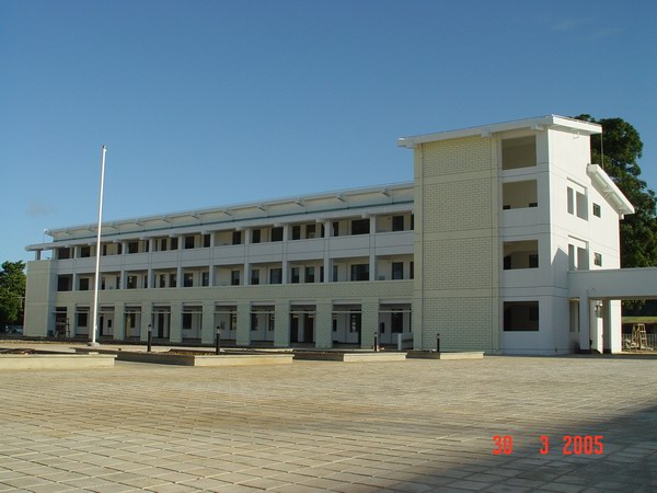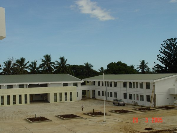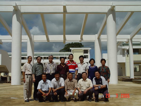 由我国政府援助的汤加首都中学项目于2003年10月28日正式开工,2005年3与25日竣工,共分为1#、2#、3#号教学楼,行政办公图书楼,工艺楼,实验楼和室外工程7个分项。 照片为驻汤使馆高善海大使(后排左3)、经商处王全火一秘(后排右4)及商务部验收组、项目监理、设计代表和技术组长等检查工程质量后在学校大门口合影。